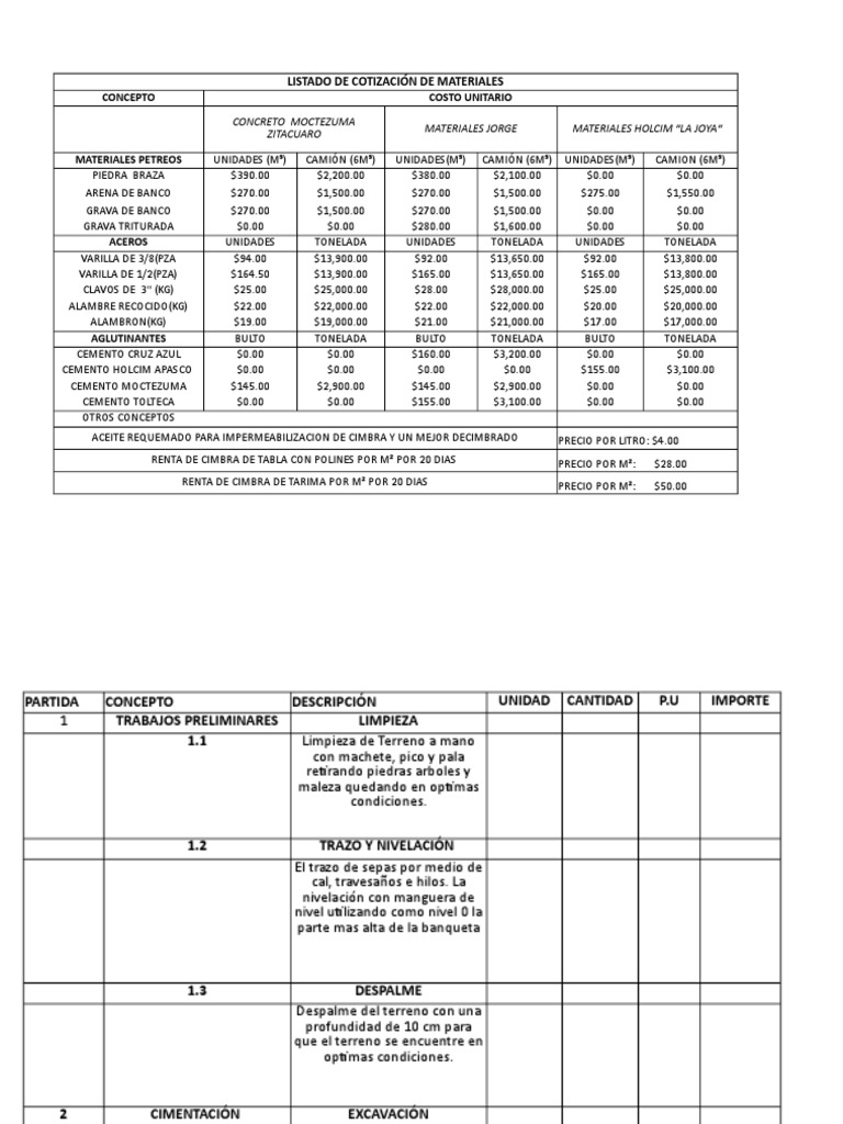 PRECIOS DE MATERIALES PARA CONSTRUCCION Docsity
